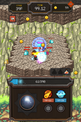左下の丸を動かすとジャックは移動するんですがタップした場所へも移動するのでスライムをタップしてどんどん倒して行くのが個人的には楽でした。基本的にはジャックがスライムを駆除するのですが、10階毎に現れるボス戦と特殊能力を持ったスライム(ビームを発射したり火の玉をはいてきたり色々います)にはローズの魔法が効果的。