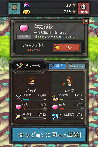 主人公の冒険者ジャックがスライムを退治し魔法師ローズは各ステージクリアに必要なマナをためる(何も行動しないと勝手にどんどんためてくれる)というシステムも内容もシンプルなゲームなのですが999階に到達しようと思うとかなり歯ごたえがあり思わず熱中してしまいます。