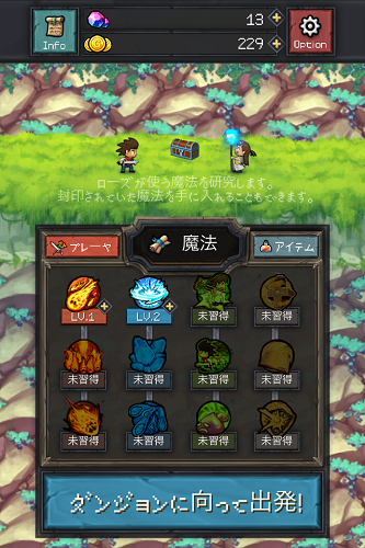 ダンジョンでゲットできるコインを使ってステータスや魔法の強化が行えます。というかダンジョンの奥深くまで潜るには強化必須! 敵もどんどん強くなるので適当にプレイしているとすぐにやられてしまいます。どちらのキャラのどのパラメータから伸ばしていくかを考えるのも楽しい。